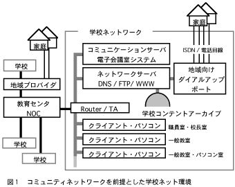 技術層では、ネットワーク回線、サーバー環境、アプリケーションの選定が課題である。図1に学校のネットワーク環境を示す。この環境の特徴は、職場や家庭から多様な手段でアクセスできるよう、地域家庭向けにダイアルアップ用ポートを学校側に設置し、かつ、プロバイダ経由のTCP/IPプロトコルによるサーバ接続を可能にしている点である。